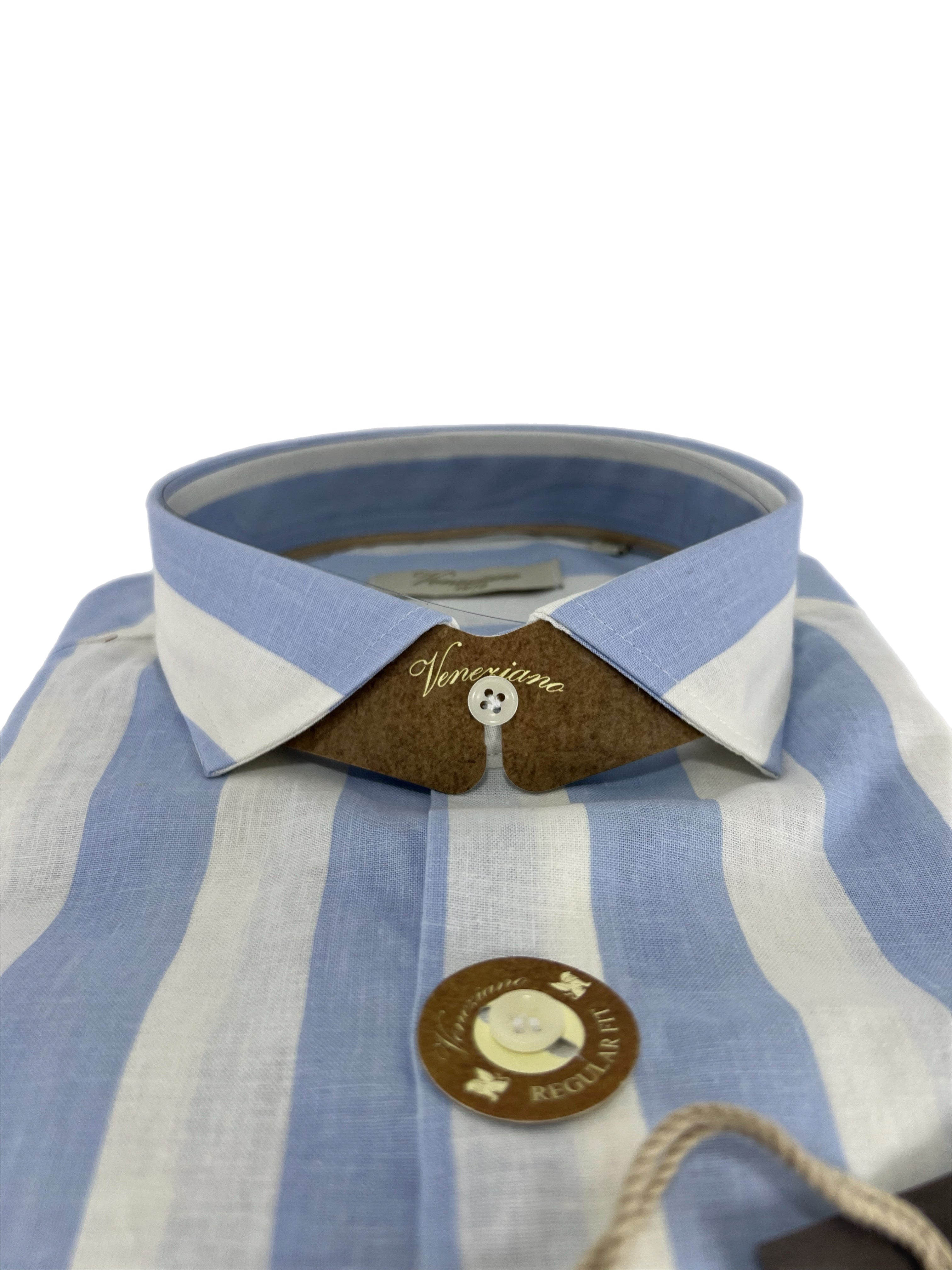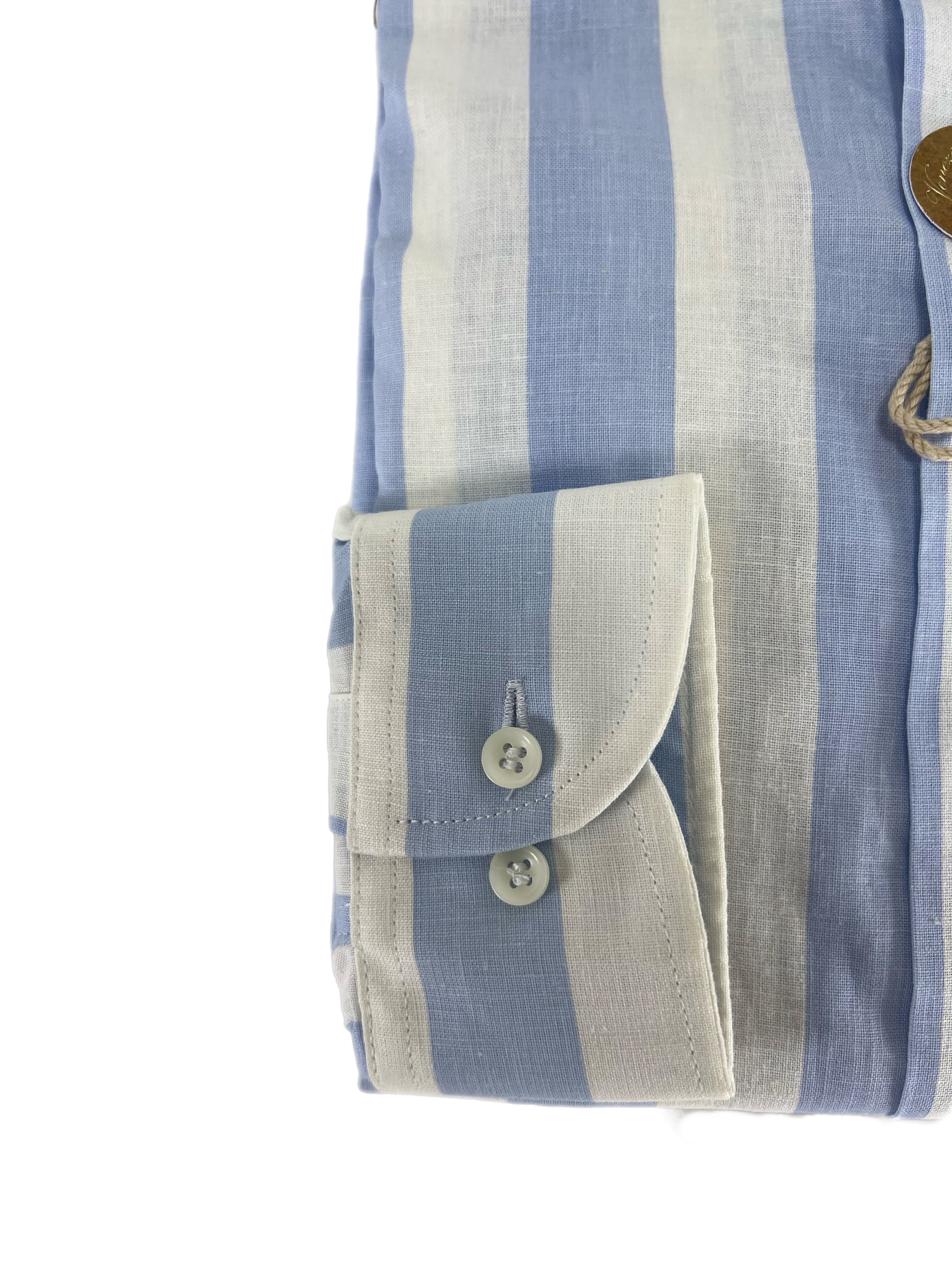 Camicia uomo in puro lino collo francese medium fit azzurra/bianca Made in Italy