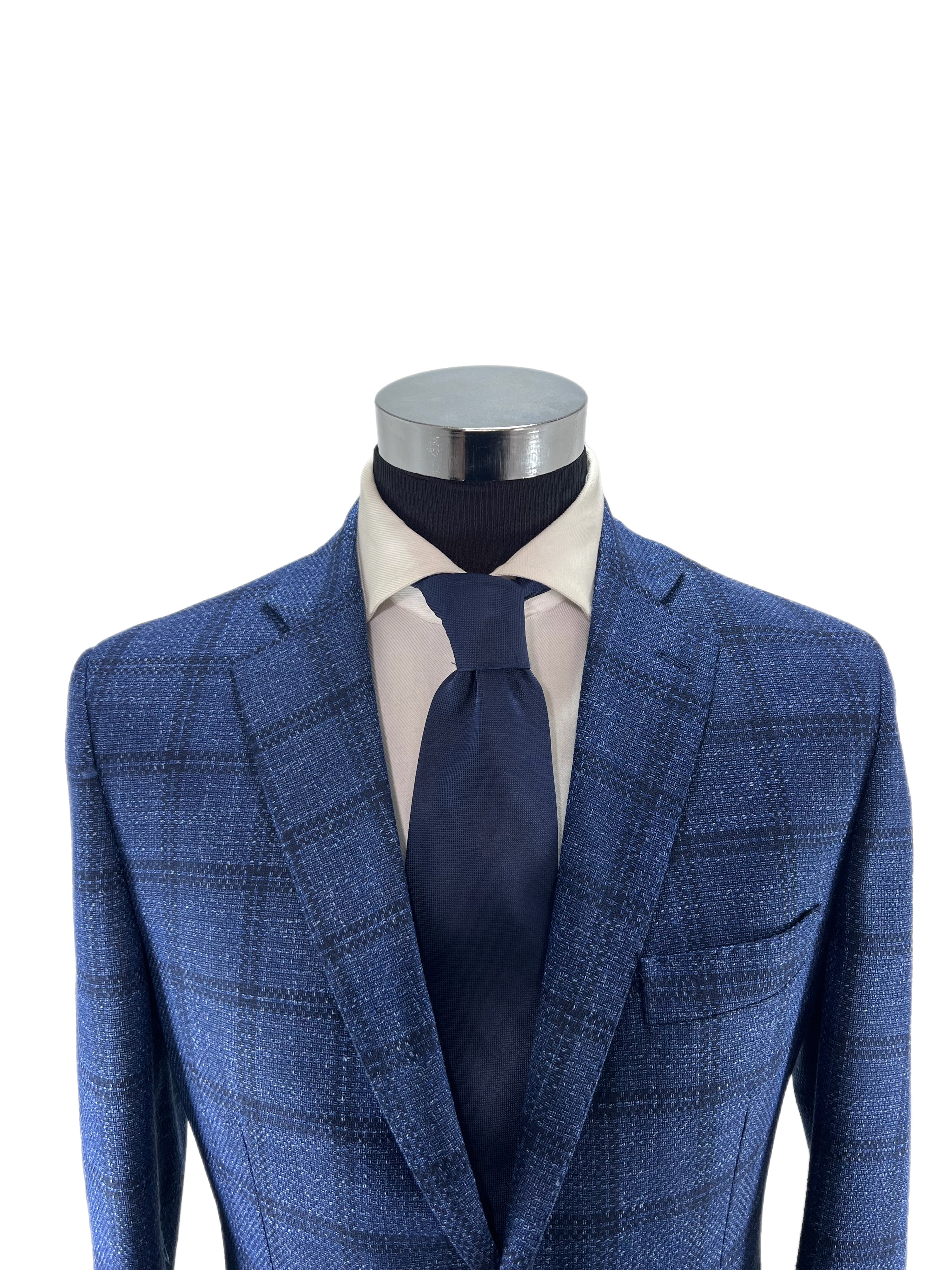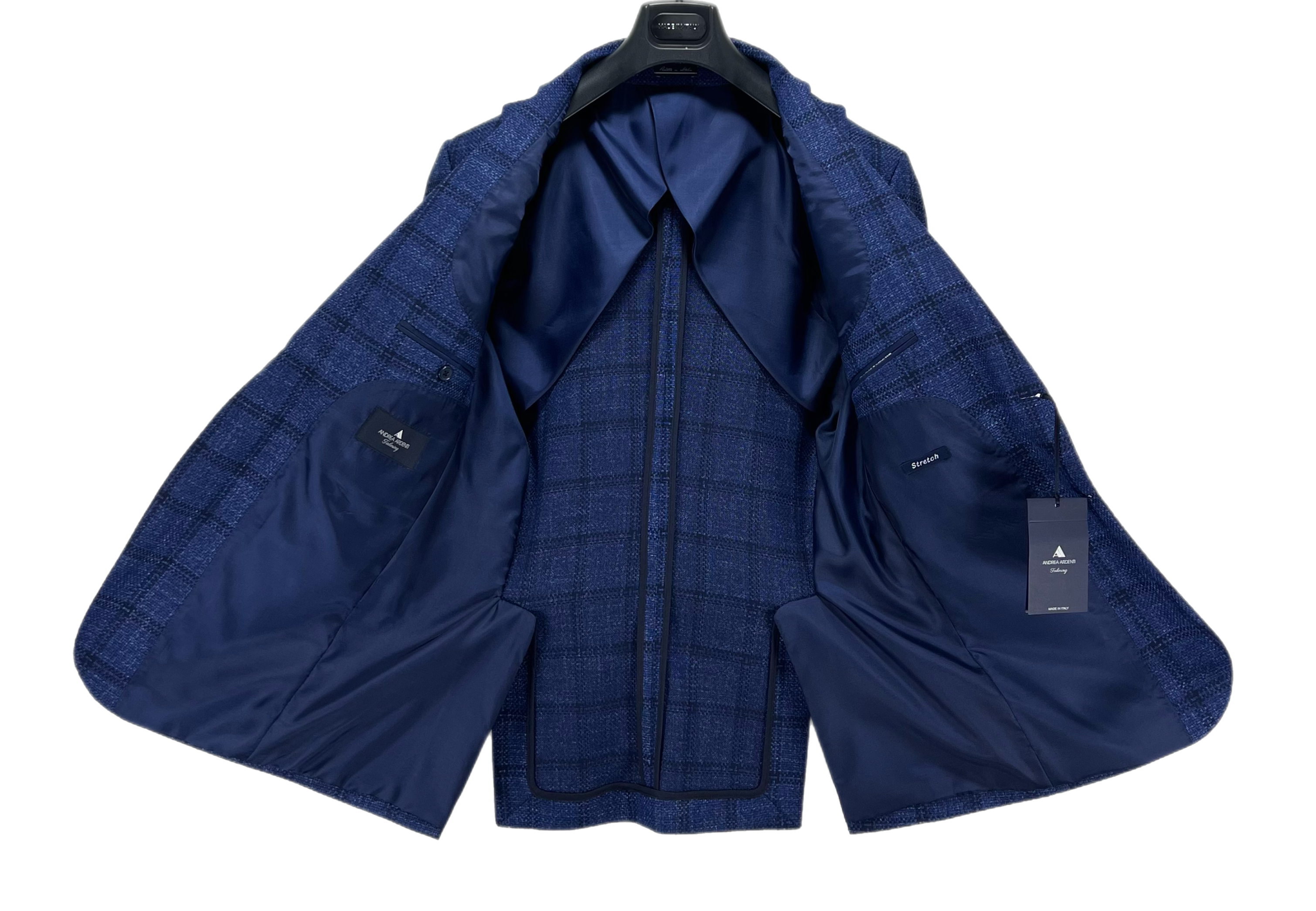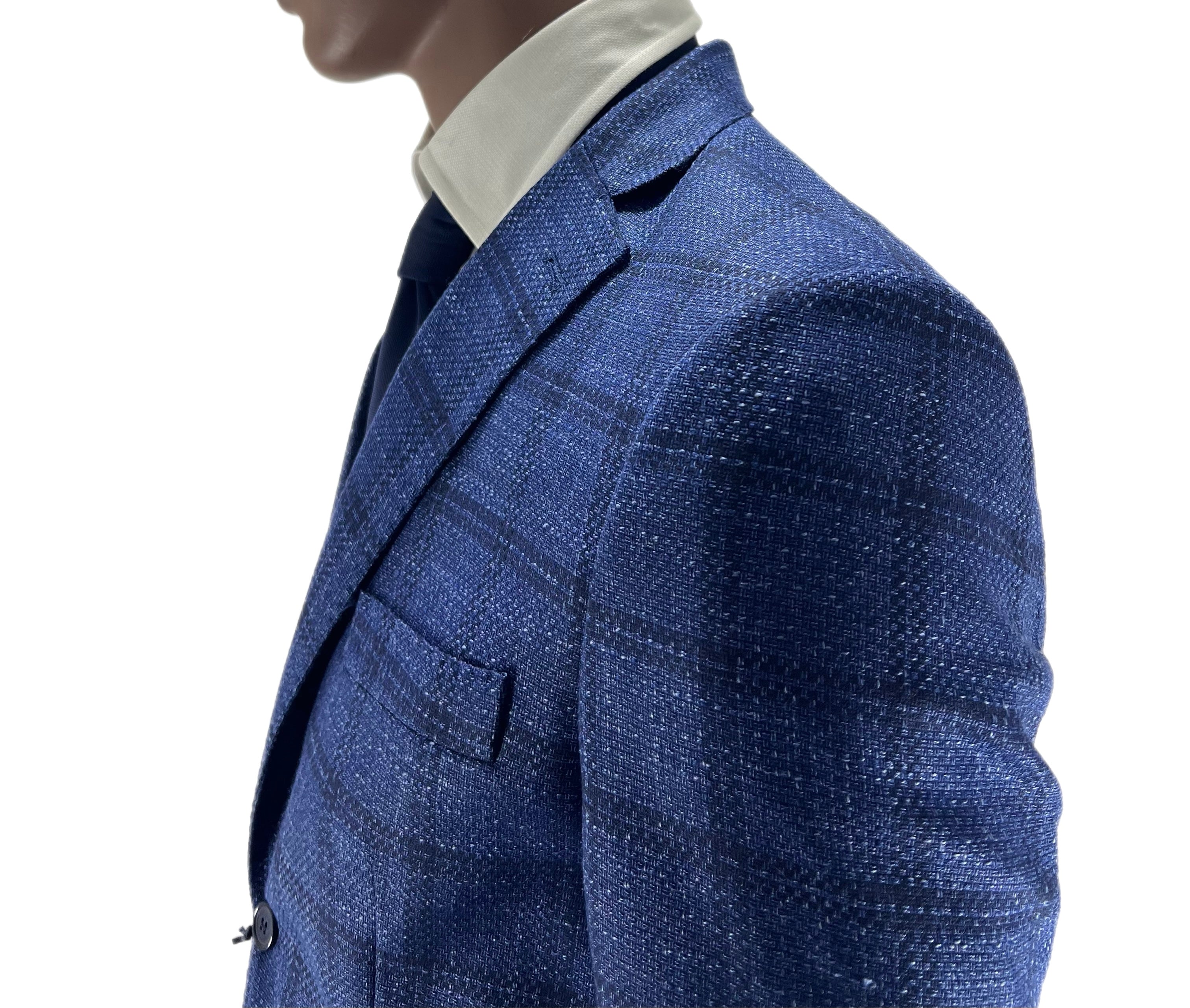 Giacca uomo sartoriale 2 bottoni in misto lana blu a quadri sfoderata