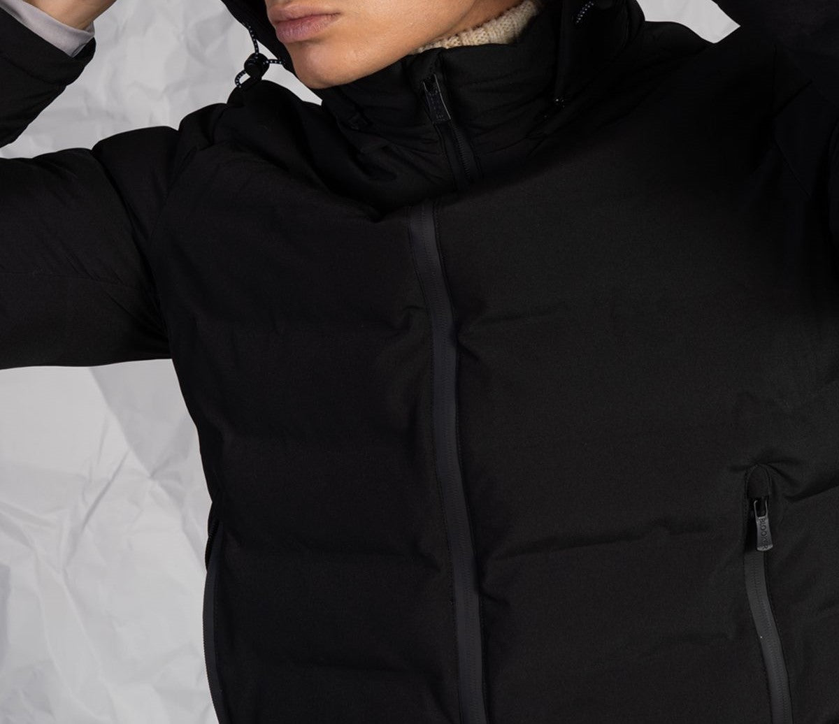 Realizzato in tessuto tecnico opaco, è dotato di imbottitura calda e leggera, ideale per affrontare le basse temperature senza appesantire il capo. Il cappuccio fisso con coulisse regolabile offre una protezione efficace dal vento, mentre la chiusura frontale con zip e le tasche laterali con zip assicurano praticità e funzionalità nell’uso quotidiano.