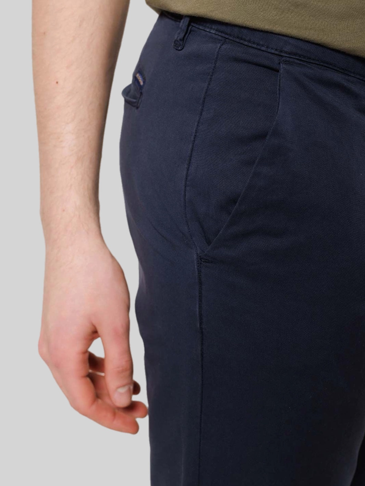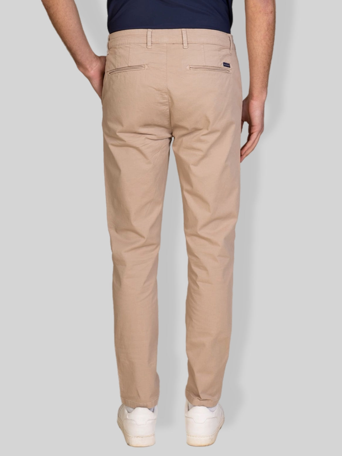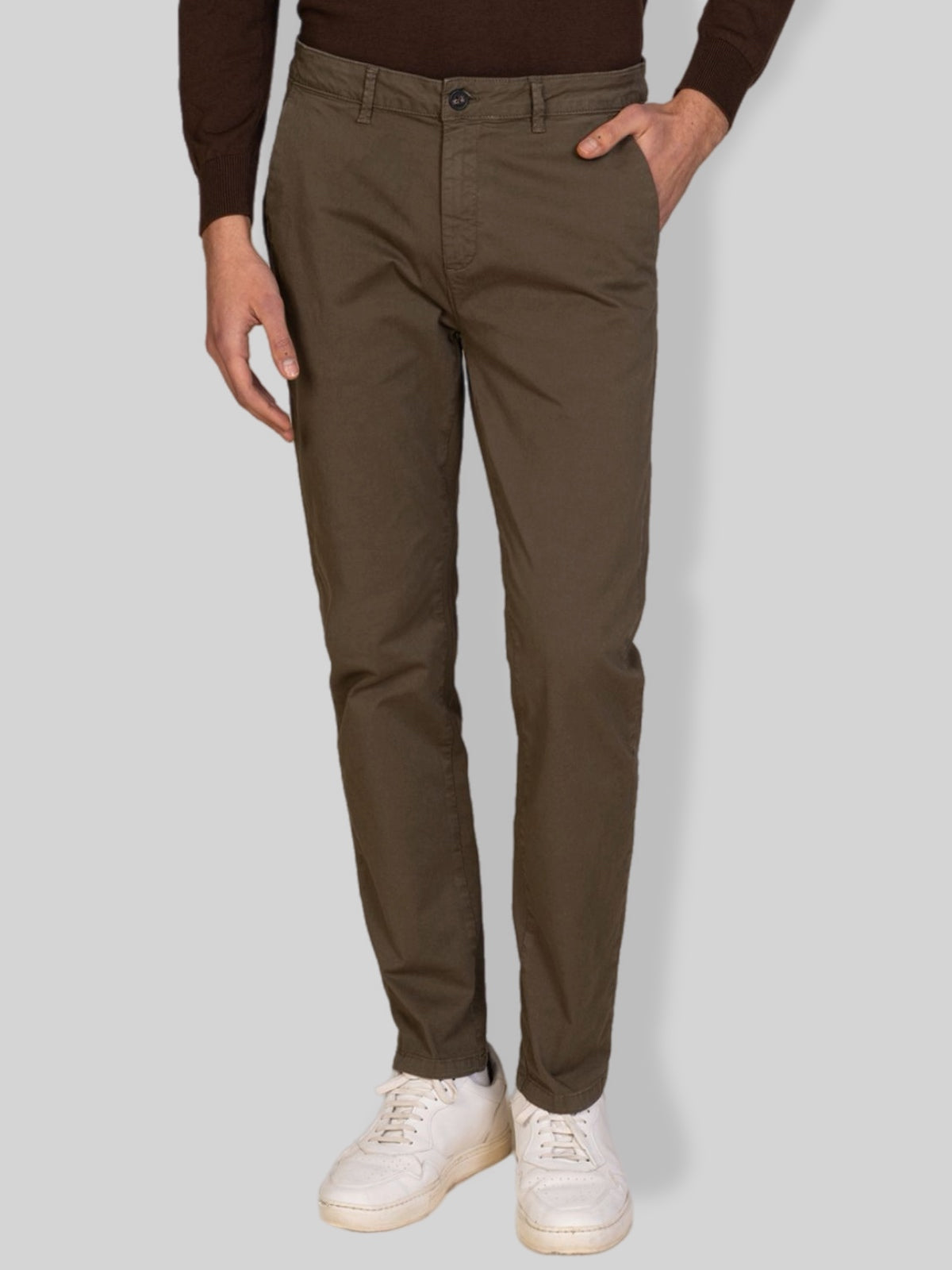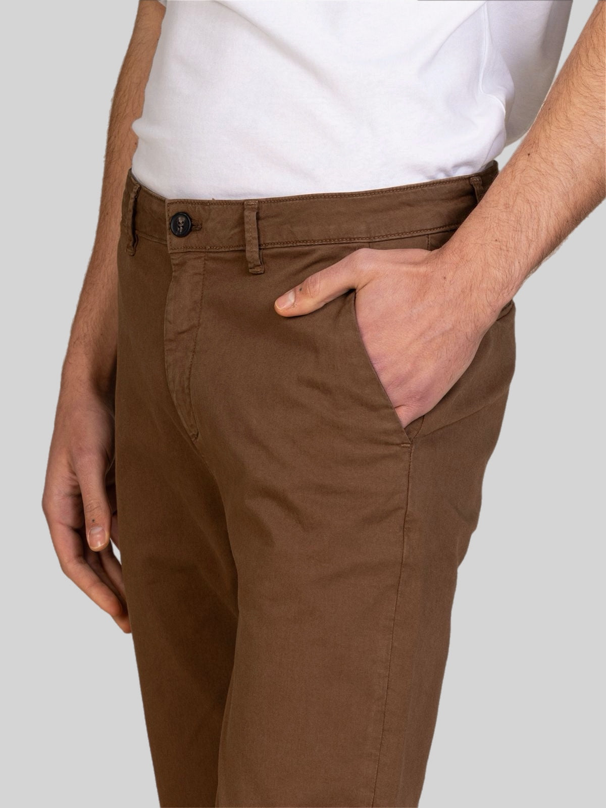 Pantalone chino uomo realizzato in gabardine di cotone, un tessuto resistente, confortevole e ideale per tutte le stagioni. Il modello presenta una vestibilità regolare con linea pulita ed elegante, perfetta sia per outfit casual che per abbinamenti più formali.
