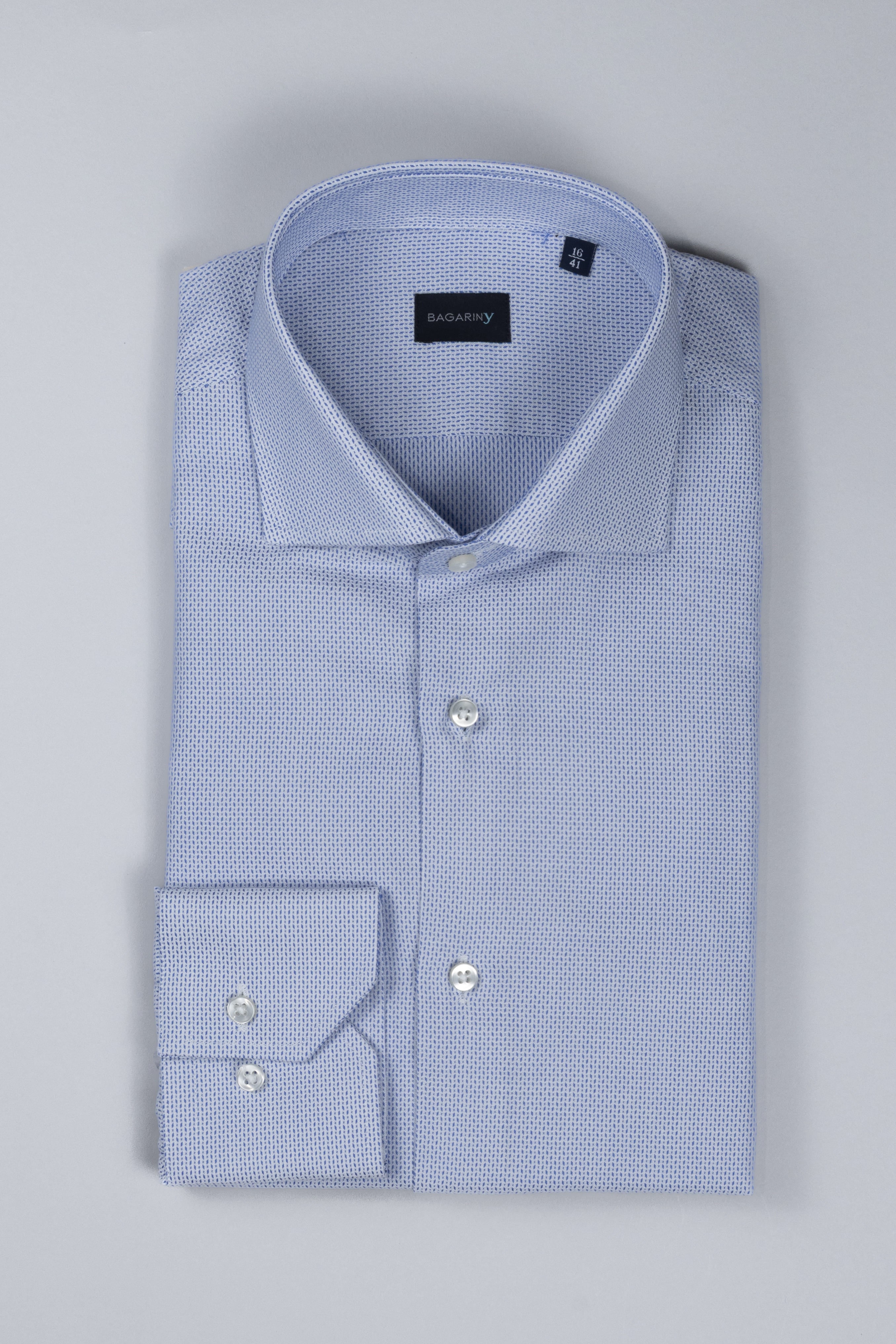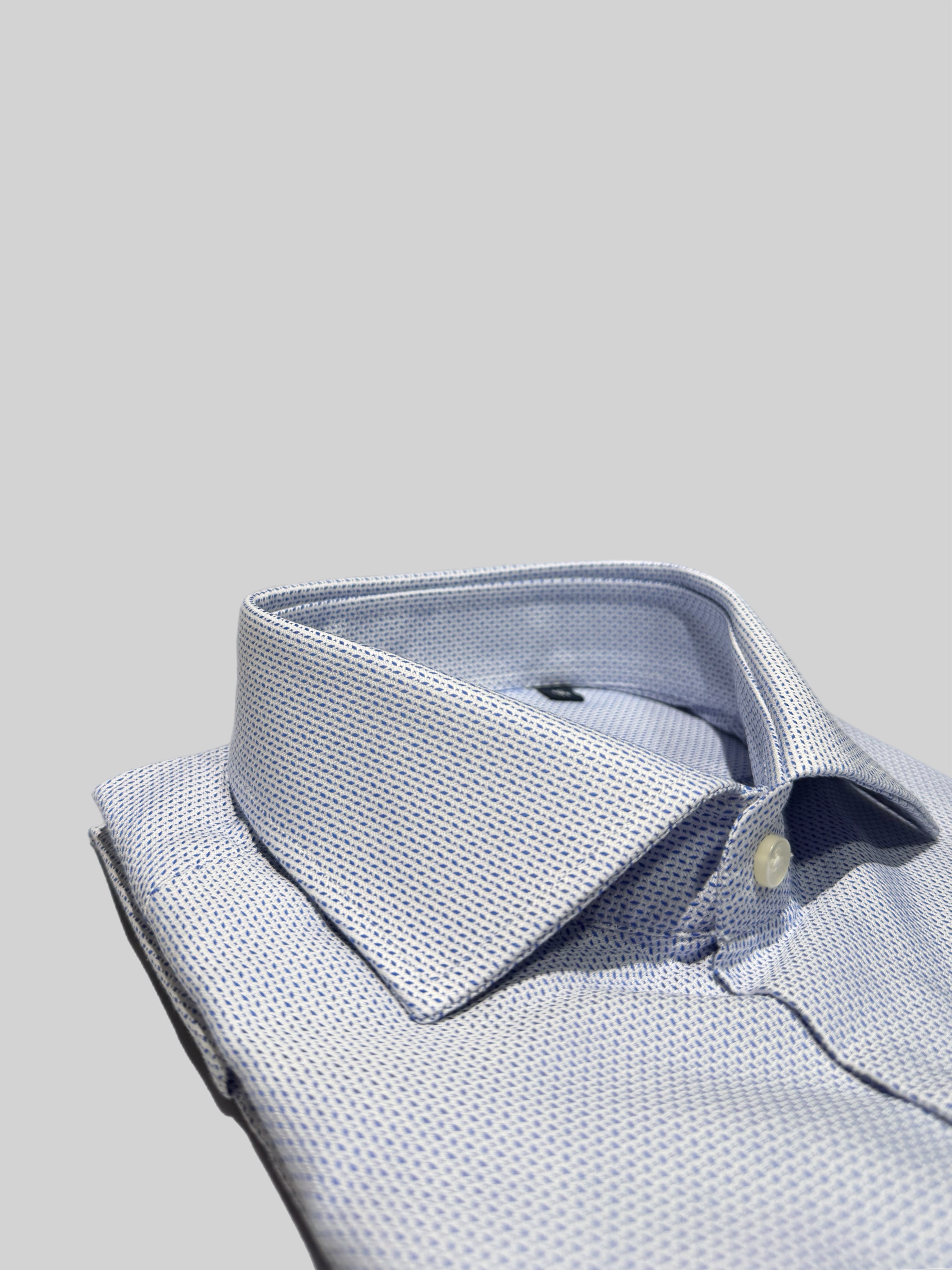 Camicia sartoriale da uomo Bagariny per Antica Sartoria Napoletana realizzata in cotone strutturato di alta qualità, caratterizzato da una micro tessitura armaturata che dona al tessuto profondità, corpo e un aspetto raffinato. La superficie leggermente materica conferisce eleganza discreta e valorizza il capo senza risultare eccessiva.