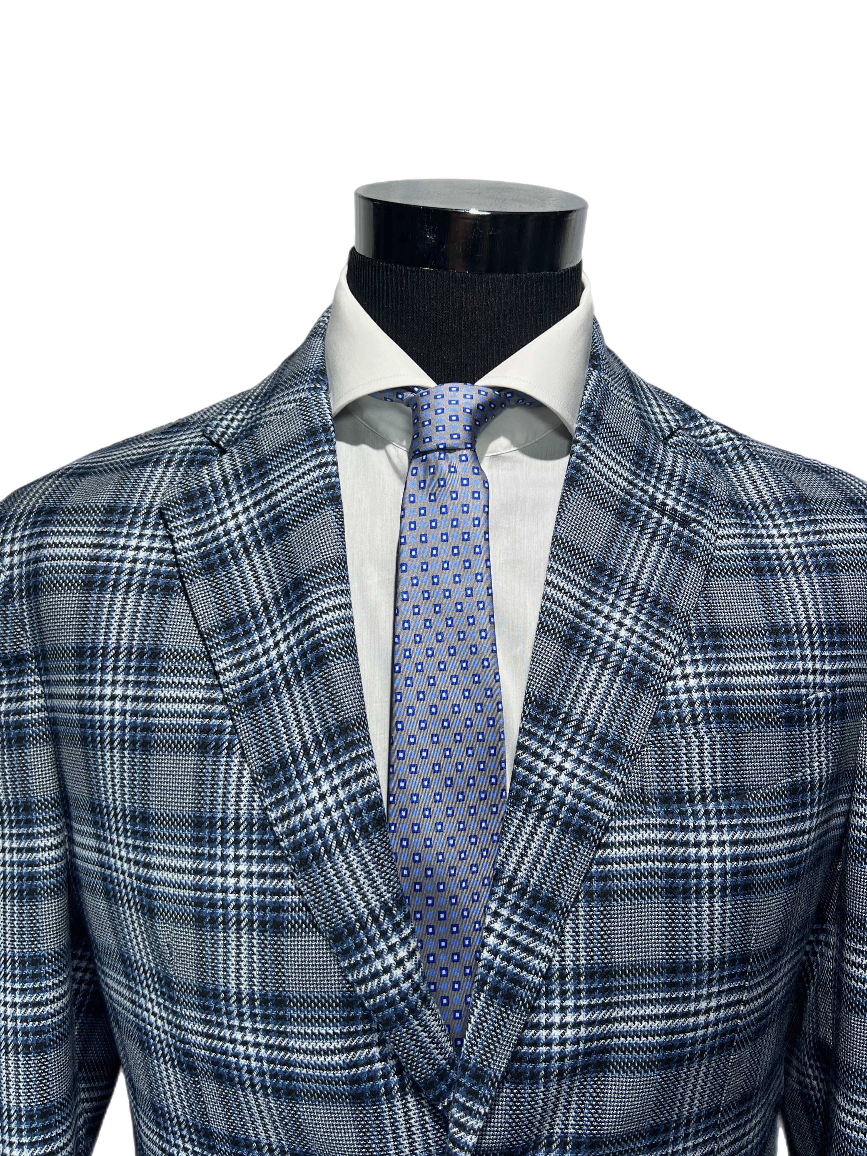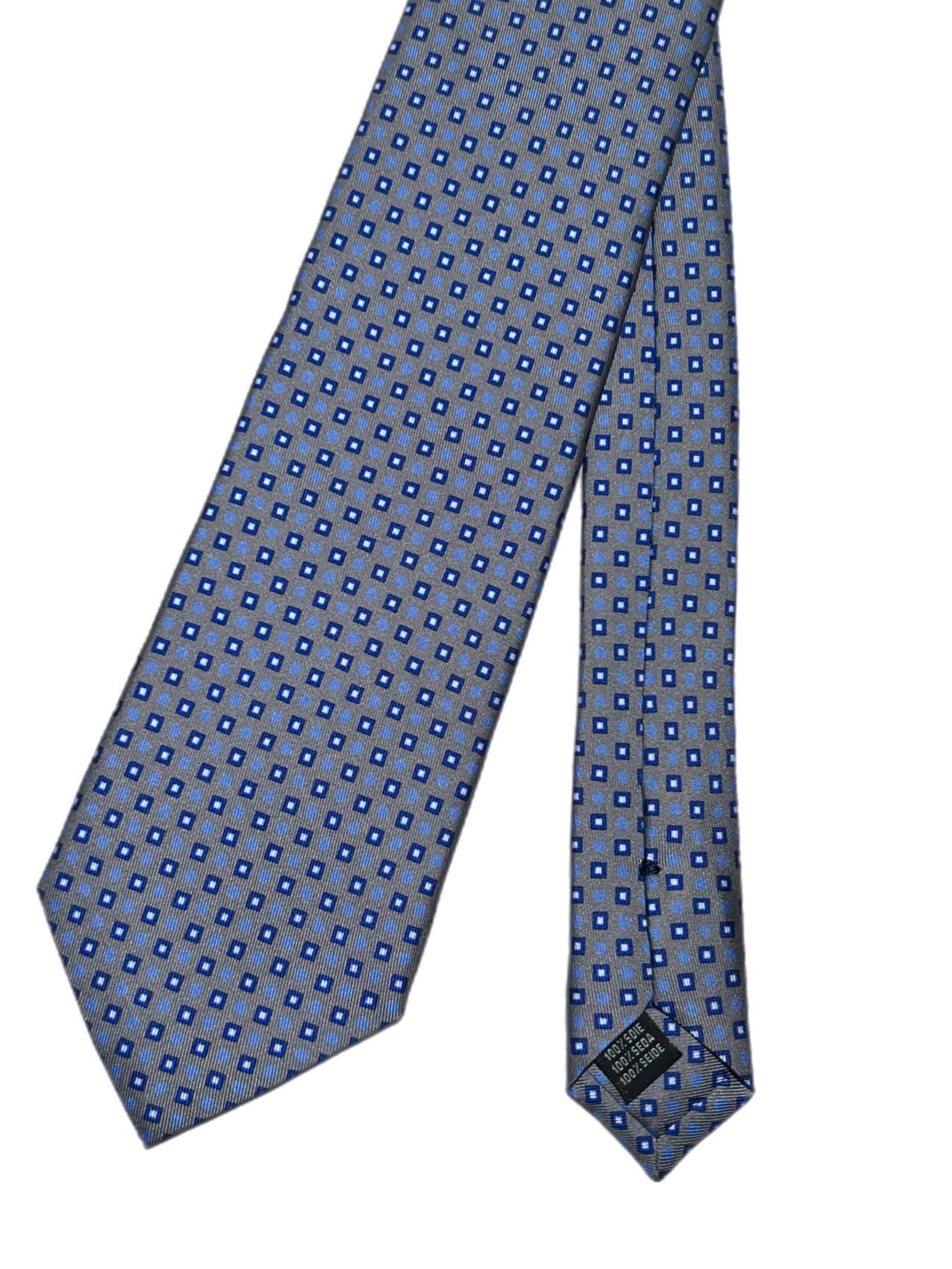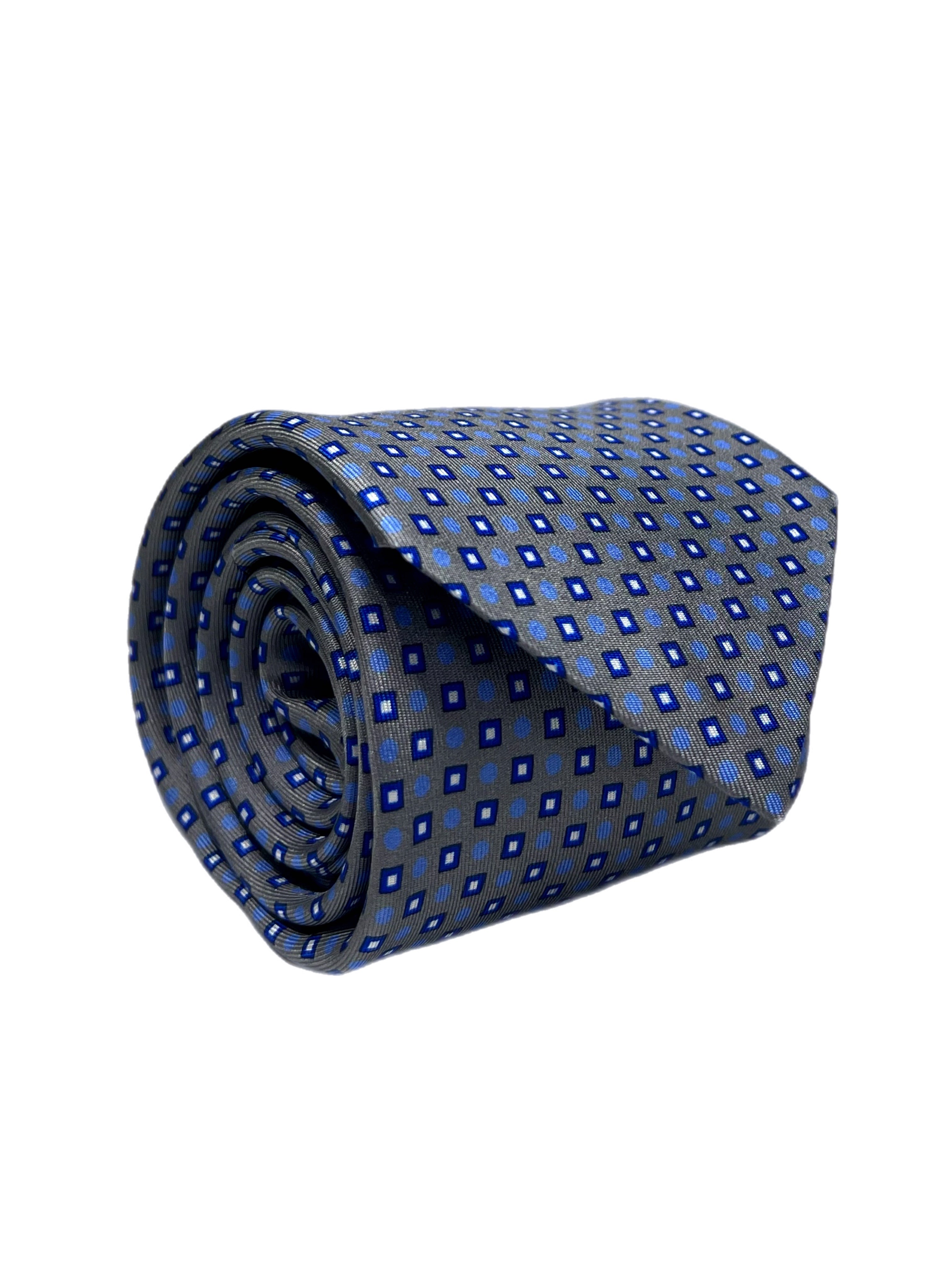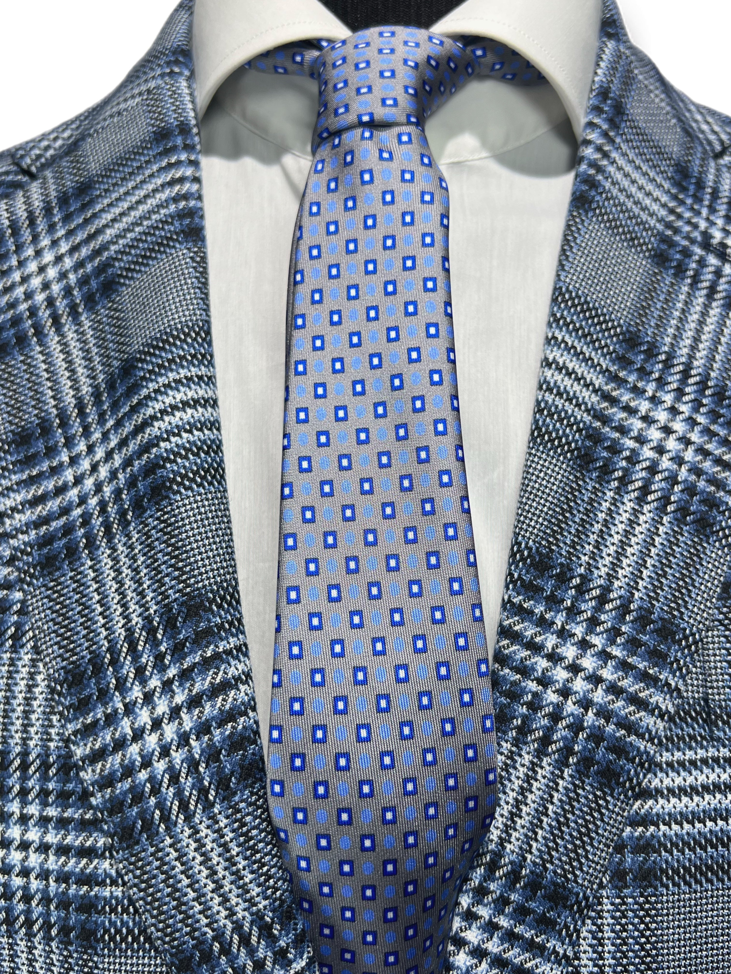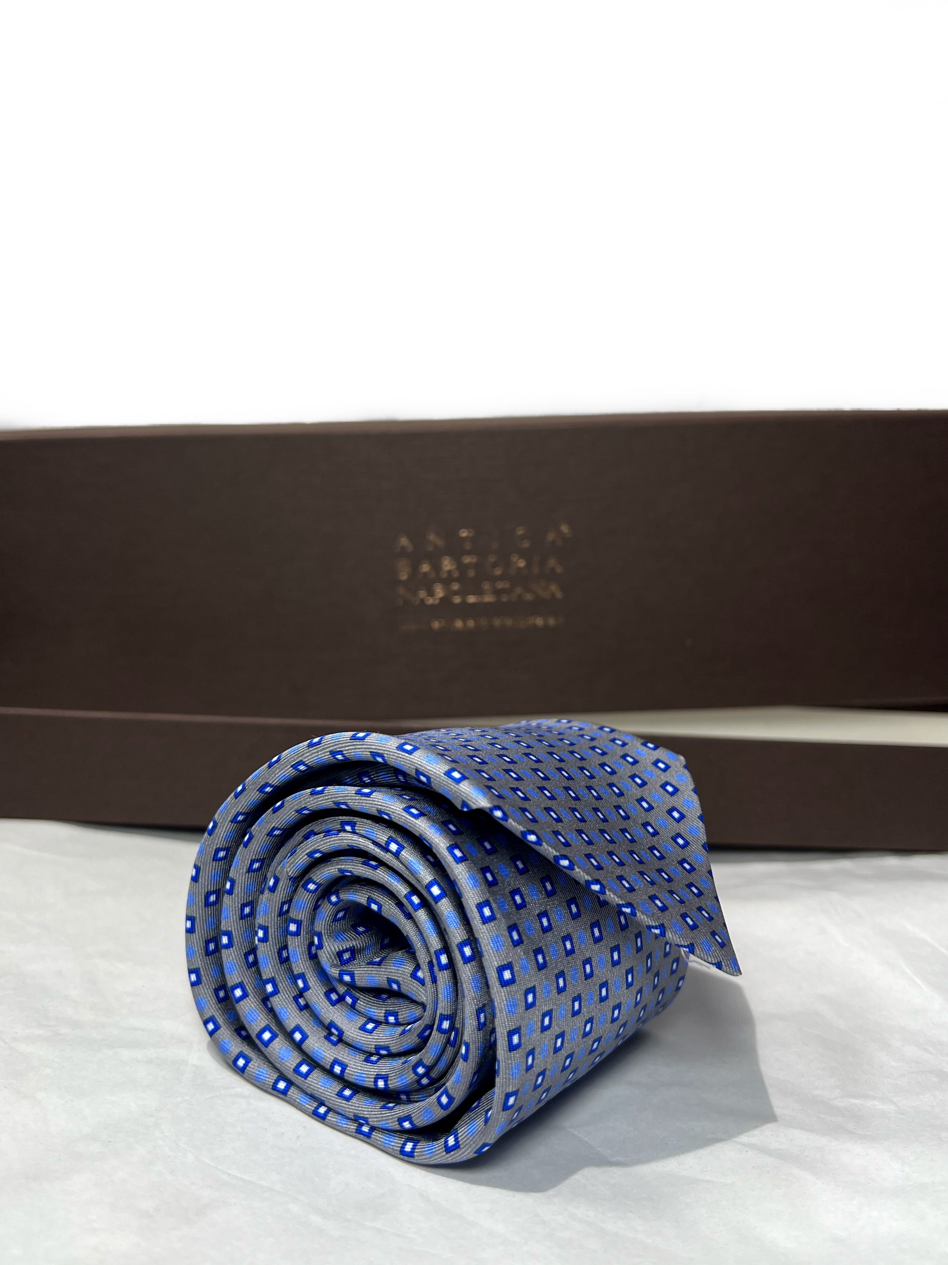 Questa cravatta in pura seta, con motivi blu/celesti/bianco su fondo grigio scuro, rappresenta l’essenza della sartoria napoletana: artigianalità, gusto classico e cura dei dettagli.