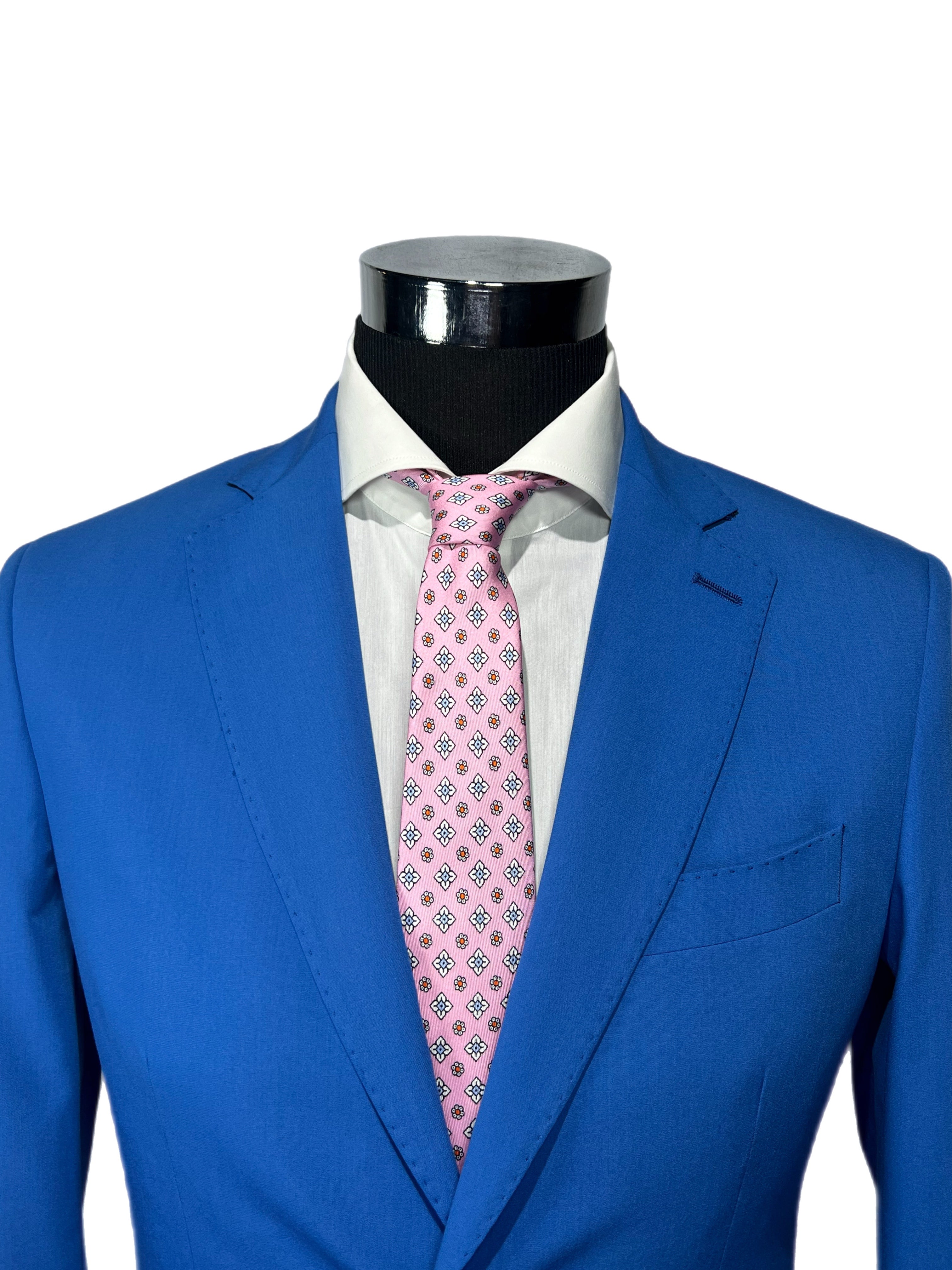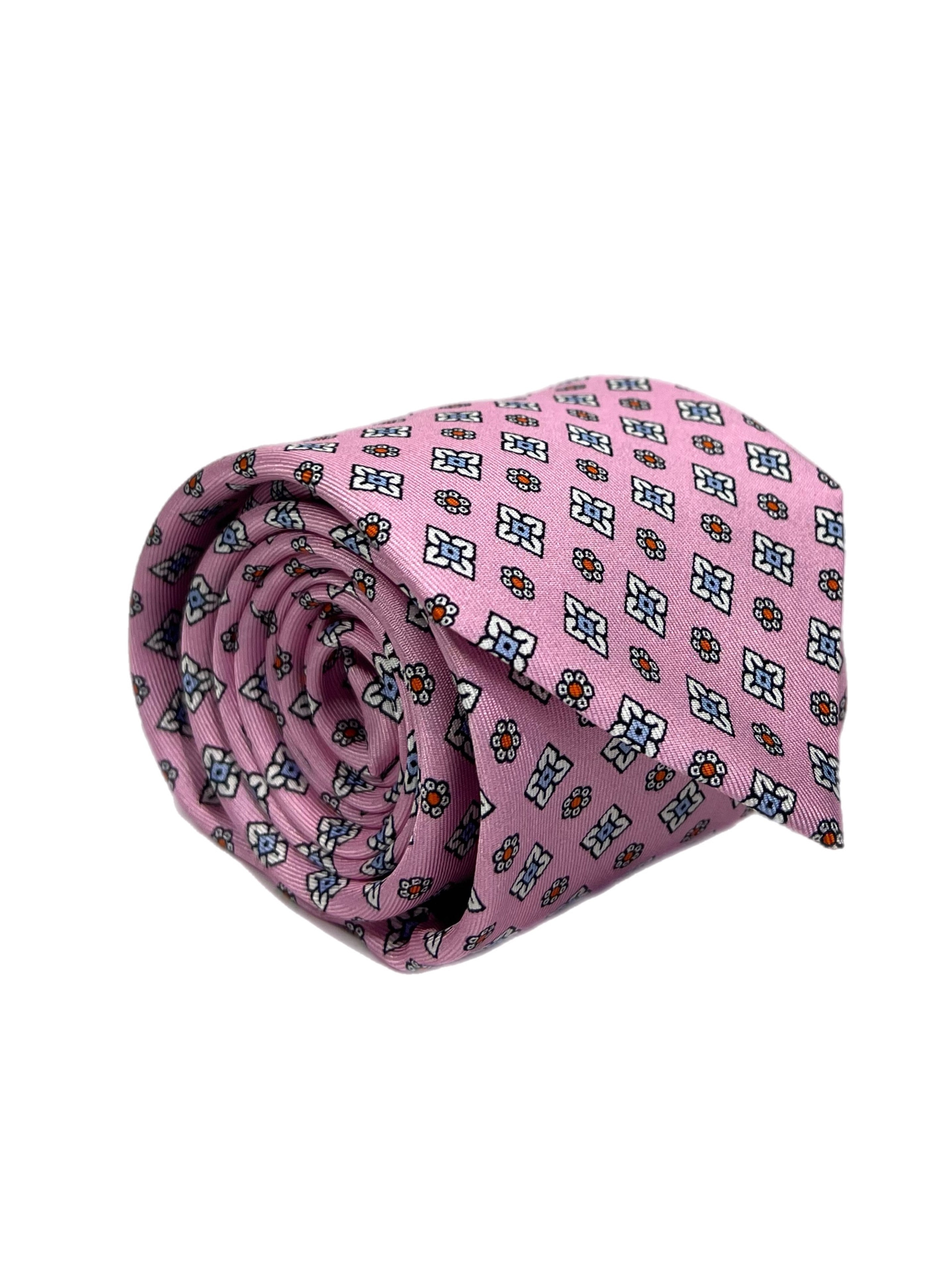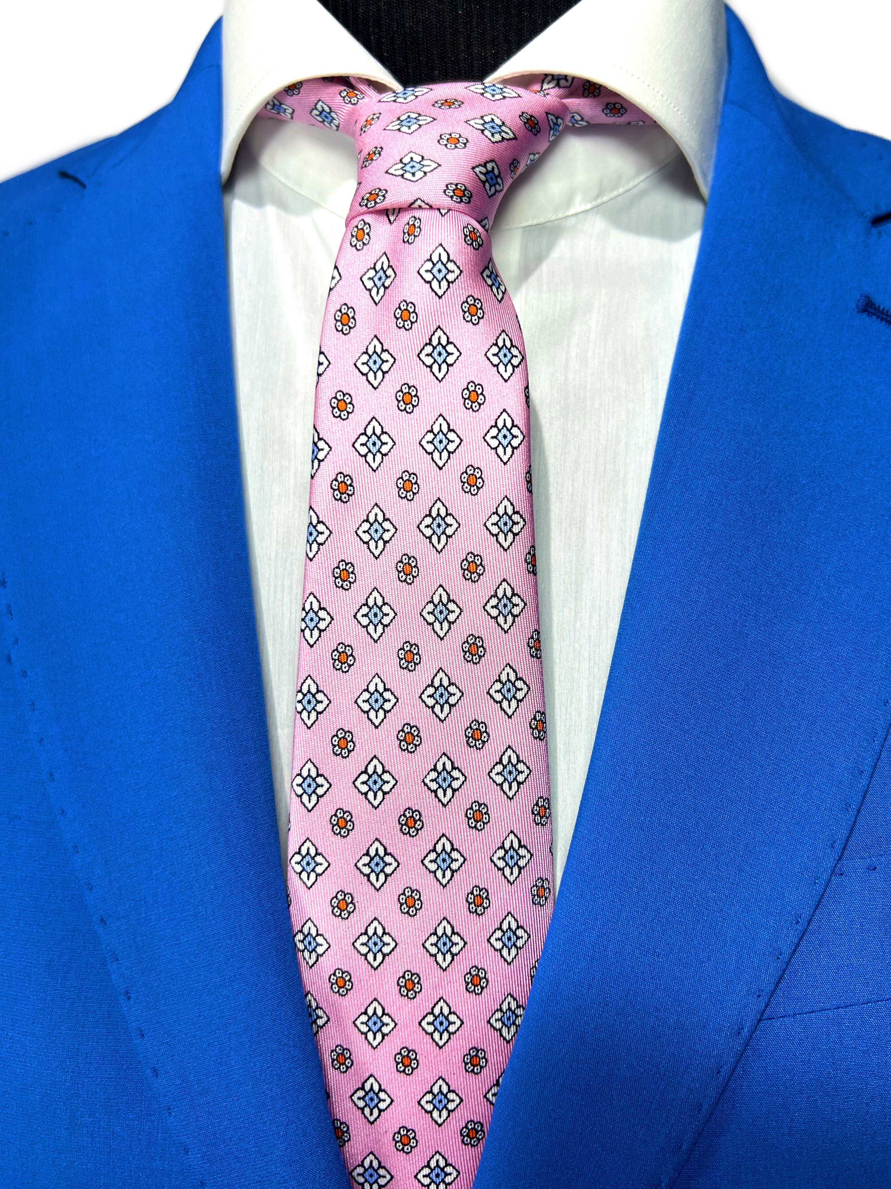 Questa cravatta in pura seta, con motivi azzurro/arancione/bianco su fondo rosa, rappresenta l’essenza della sartoria napoletana: artigianalità, gusto classico e cura dei dettagli.