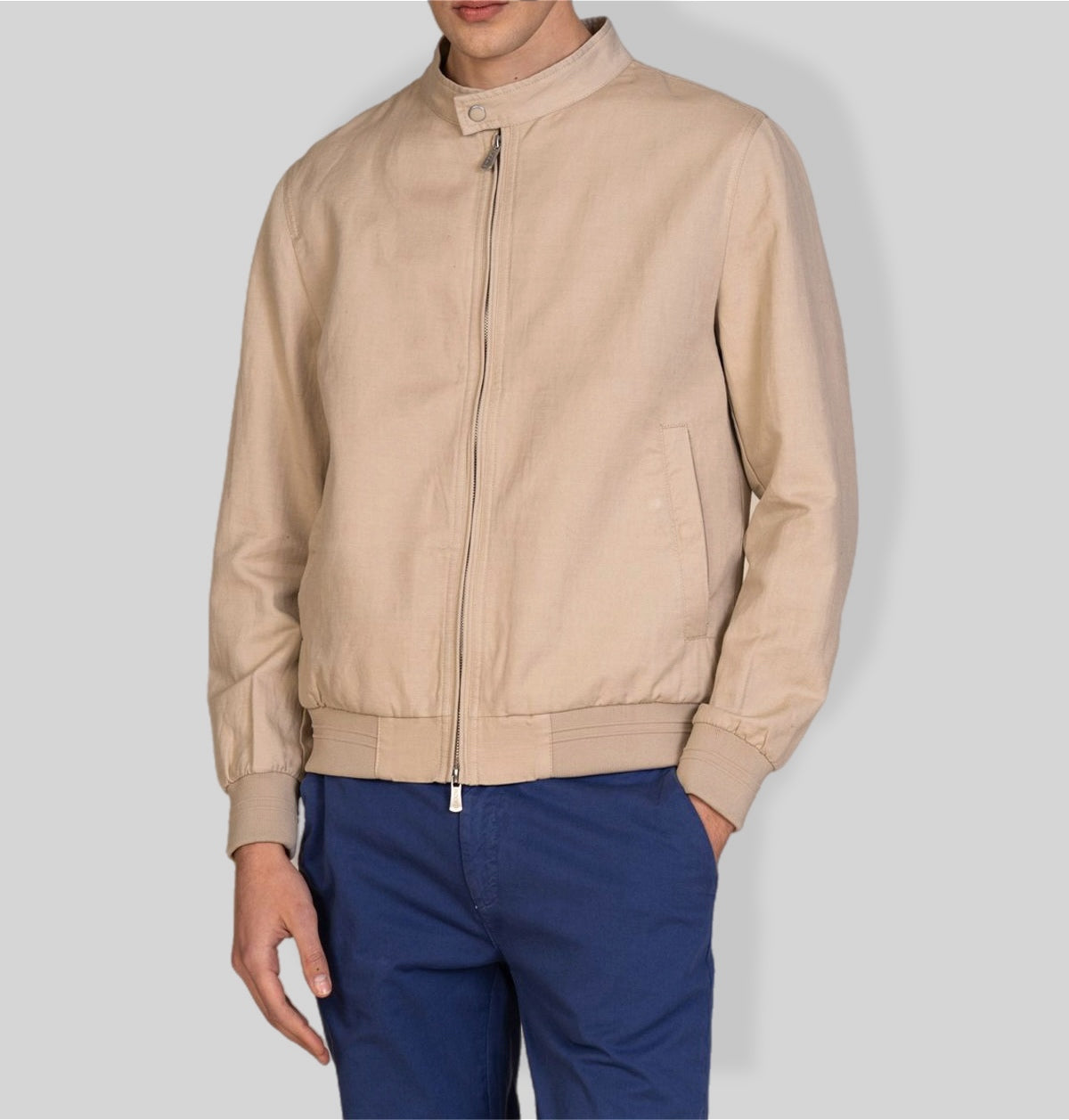 Giacca uomo realizzata in un raffinato tessuto misto lino e cotone, ideale per la stagione primavera estate grazie alla sua leggerezza e traspirabilità. Il design essenziale con collo alla coreana dona un’eleganza contemporanea ispirata alla tradizione sartoriale.