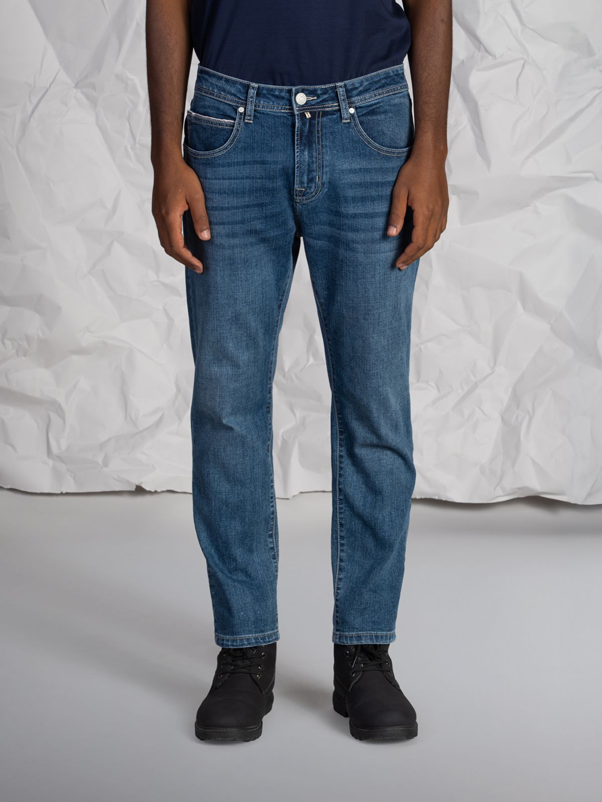 Il lavaggio blu medio con leggere sfumature dona carattere al capo, mantenendo un’estetica sobria e versatile.