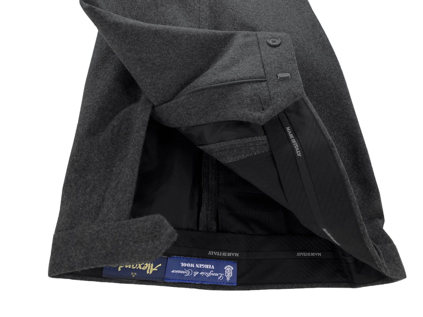 Pantalone classico sartoriale uomo Alexander realizzato in flanella di lana, frutto di una manifattura italiana attenta alla qualità dei materiali e alla cura dei dettagli. Il tessuto in flanella si distingue per la mano morbida e compatta, offrendo comfort e una piacevole sensazione di calore.