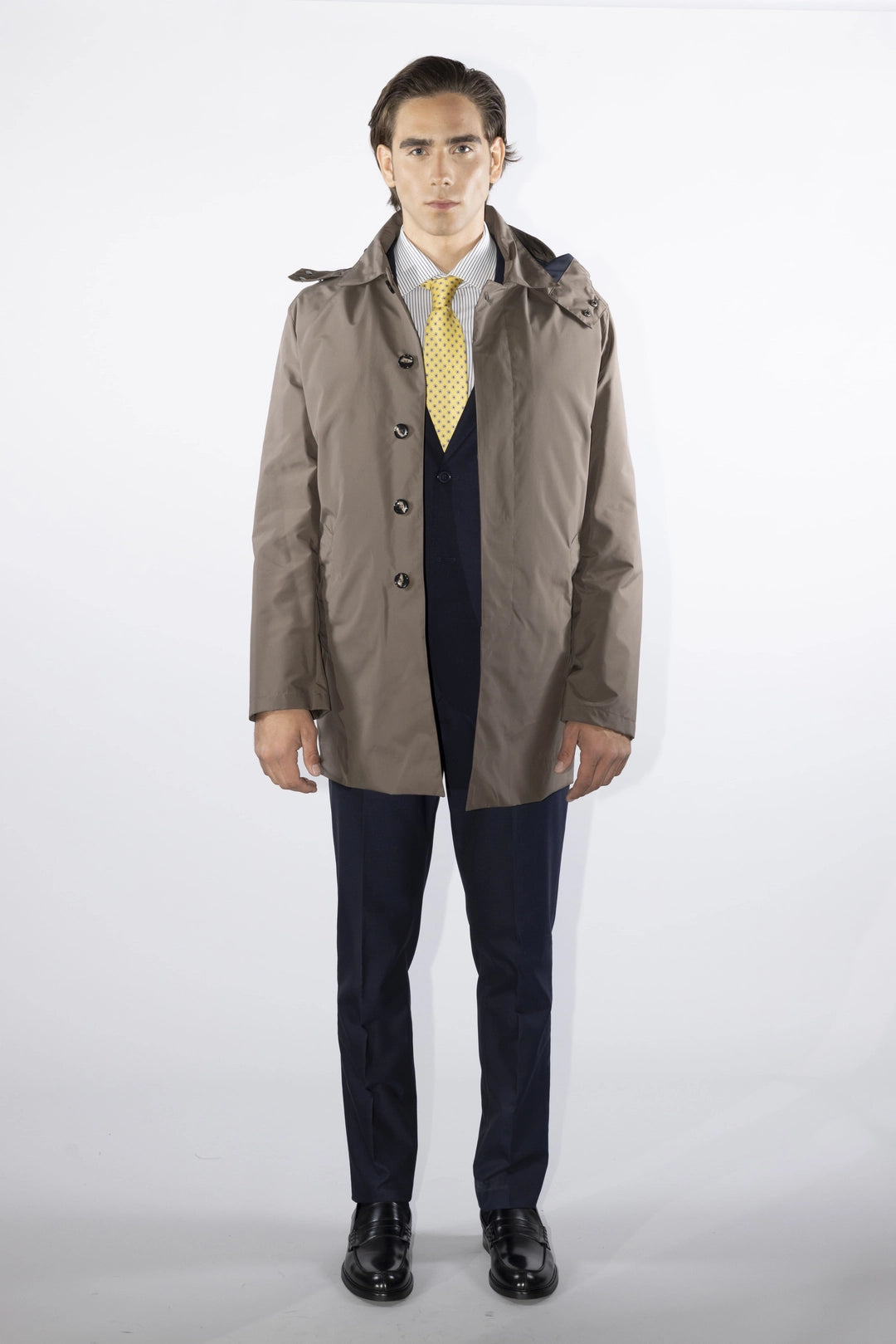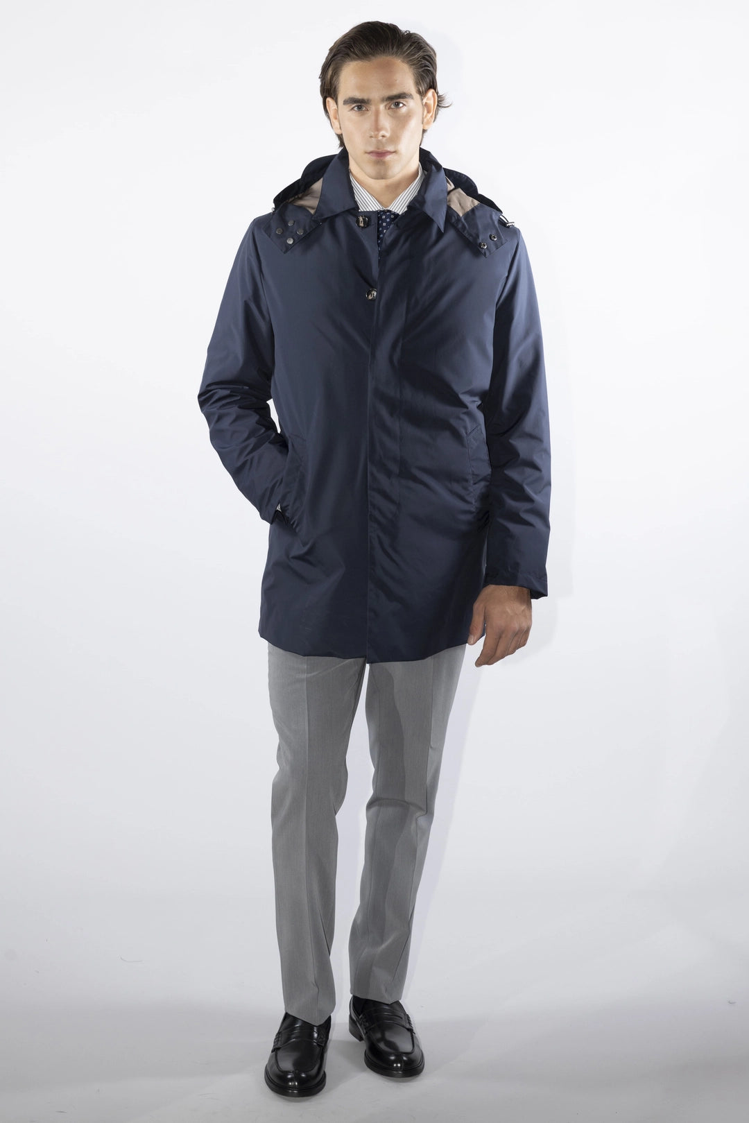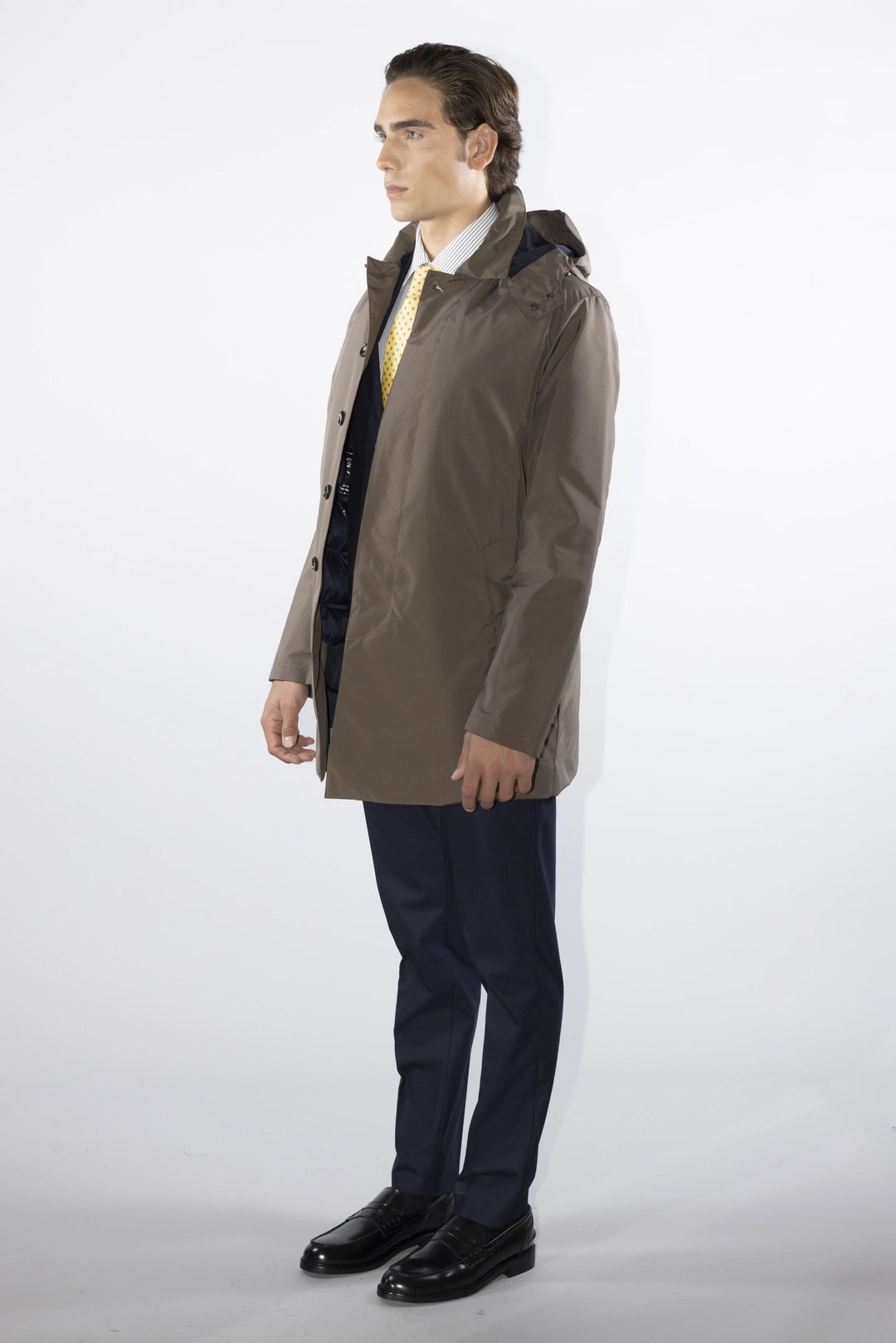 La vestibilità slim valorizza la silhouette mantenendo una linea pulita e moderna. Il design è impreziosito da un cappuccio estraibile, che consente di adattare il capo a diverse esigenze di stile e condizioni climatiche. All’interno è presente un inserto in piumino, anch’esso estraibile, che garantisce isolamento termico e comfort nelle giornate più fredde, permettendo al tempo stesso di trasformare il cappotto in una versione più leggera.